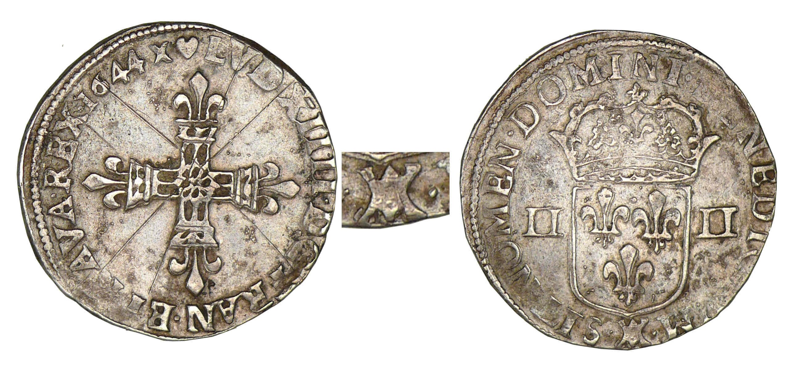Avers : A/ LVDOVICVS• XIIII• D G• FRAN• ET• NAVA• REX•. (millésime). Croix fleurdelisée.