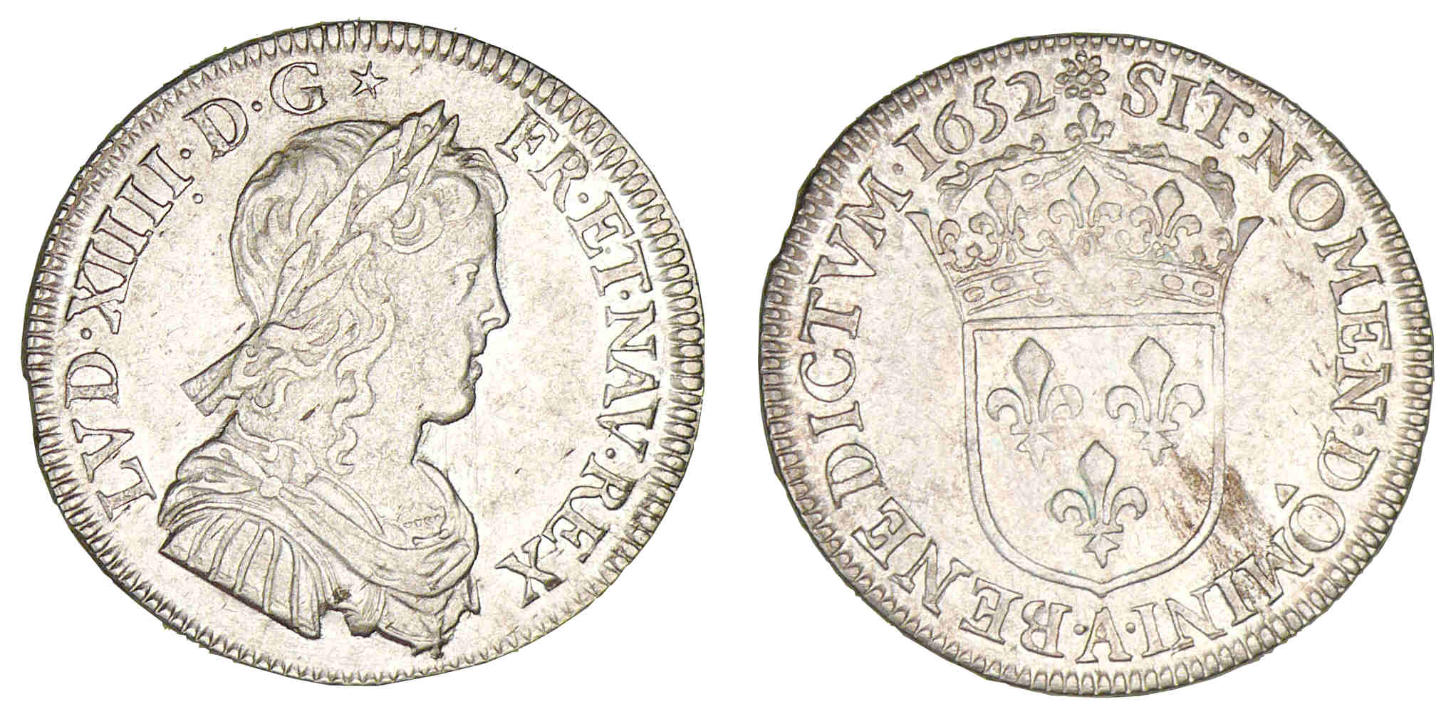 A/ LVD. XIIII. D. G. FR. ET. NAV. REX. Buste lauré et drapé à droite.
