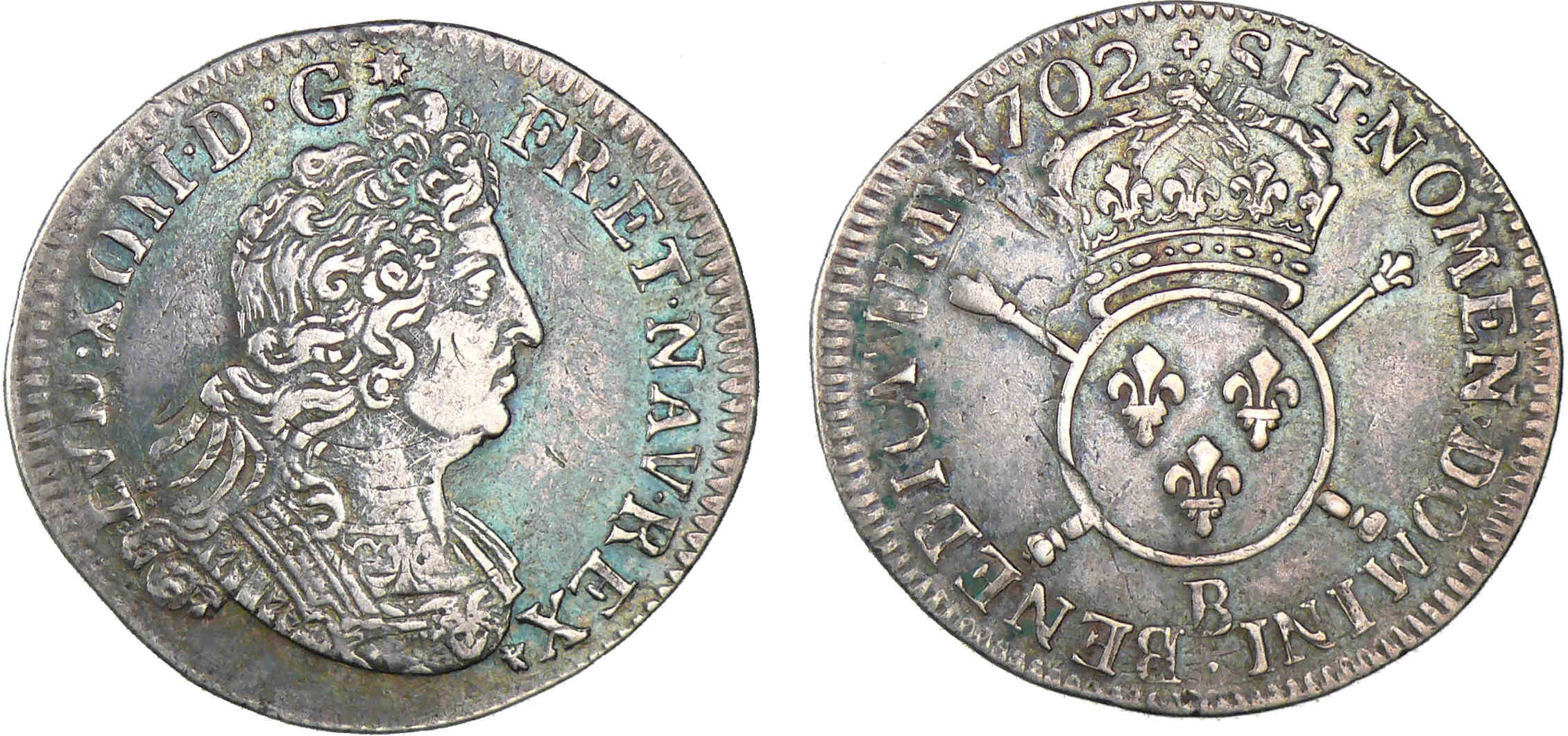 Louis XIV – Quart d’écu aux insignes – 1702 B (Rouen)