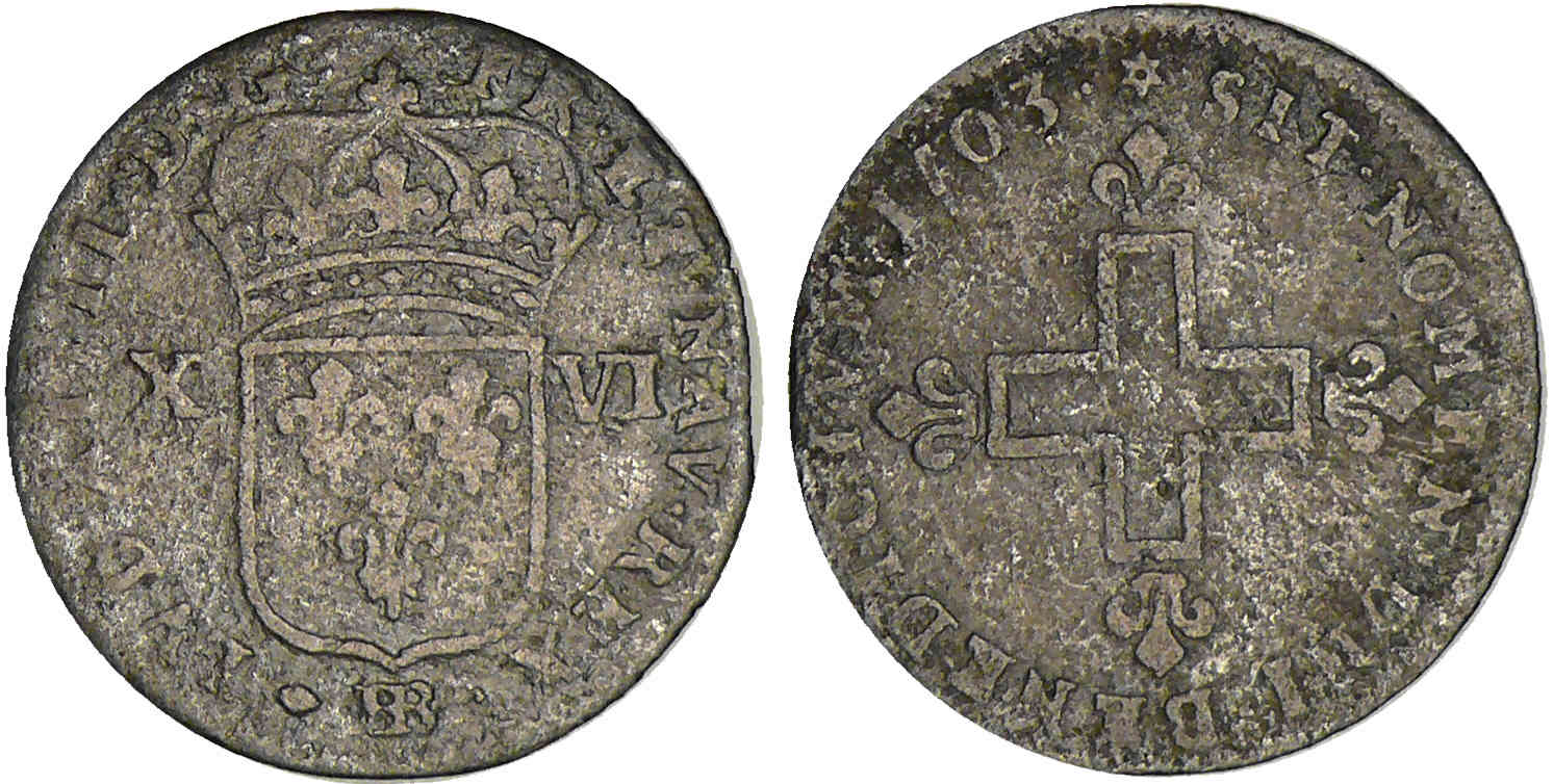 / Louis XIV – XXX deniers aux deux L couronnées – 1703 BB (Strasbourg) – Frappe médaille