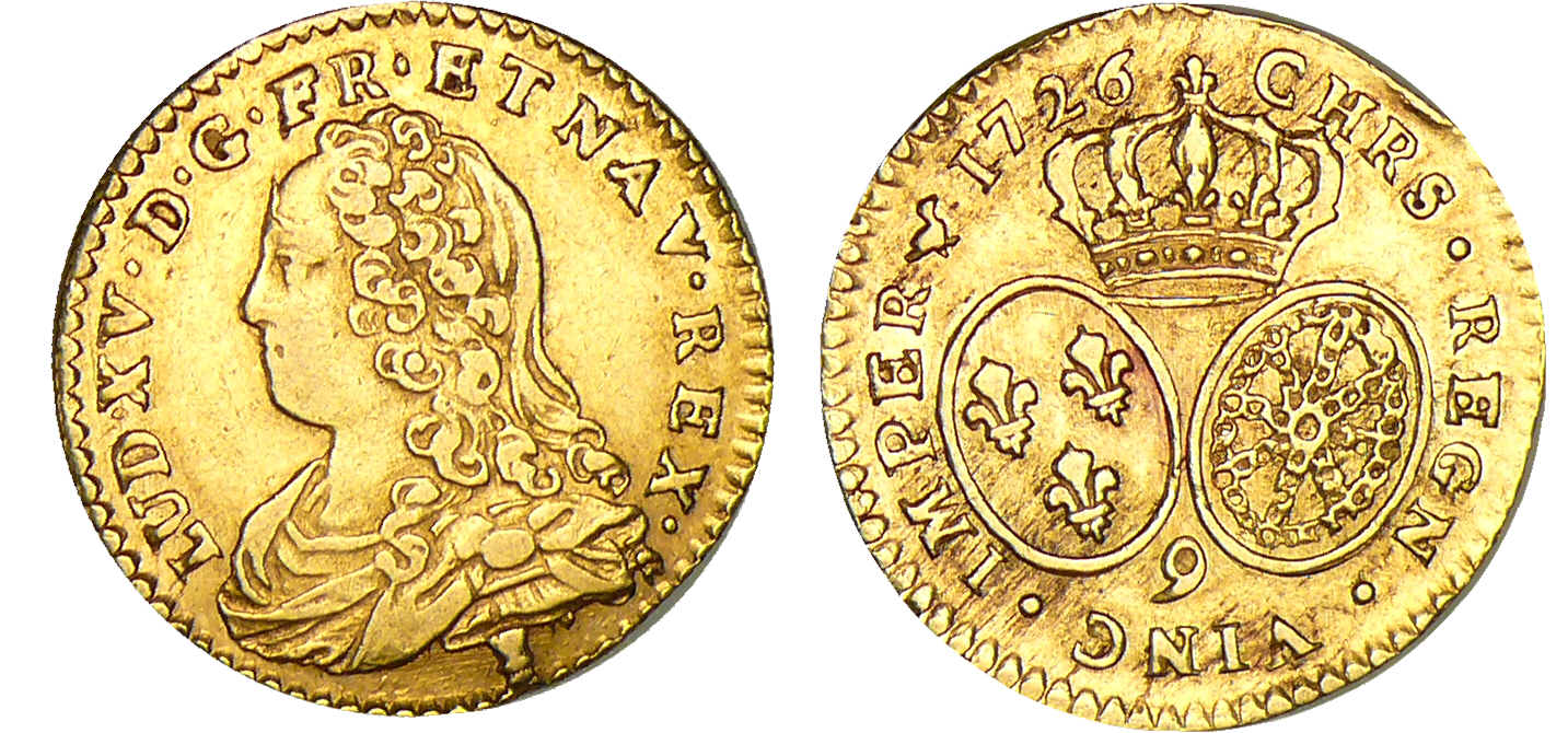 Louis XV – ½ louis d’or aux lunettes – 1726 9 (Rennes)