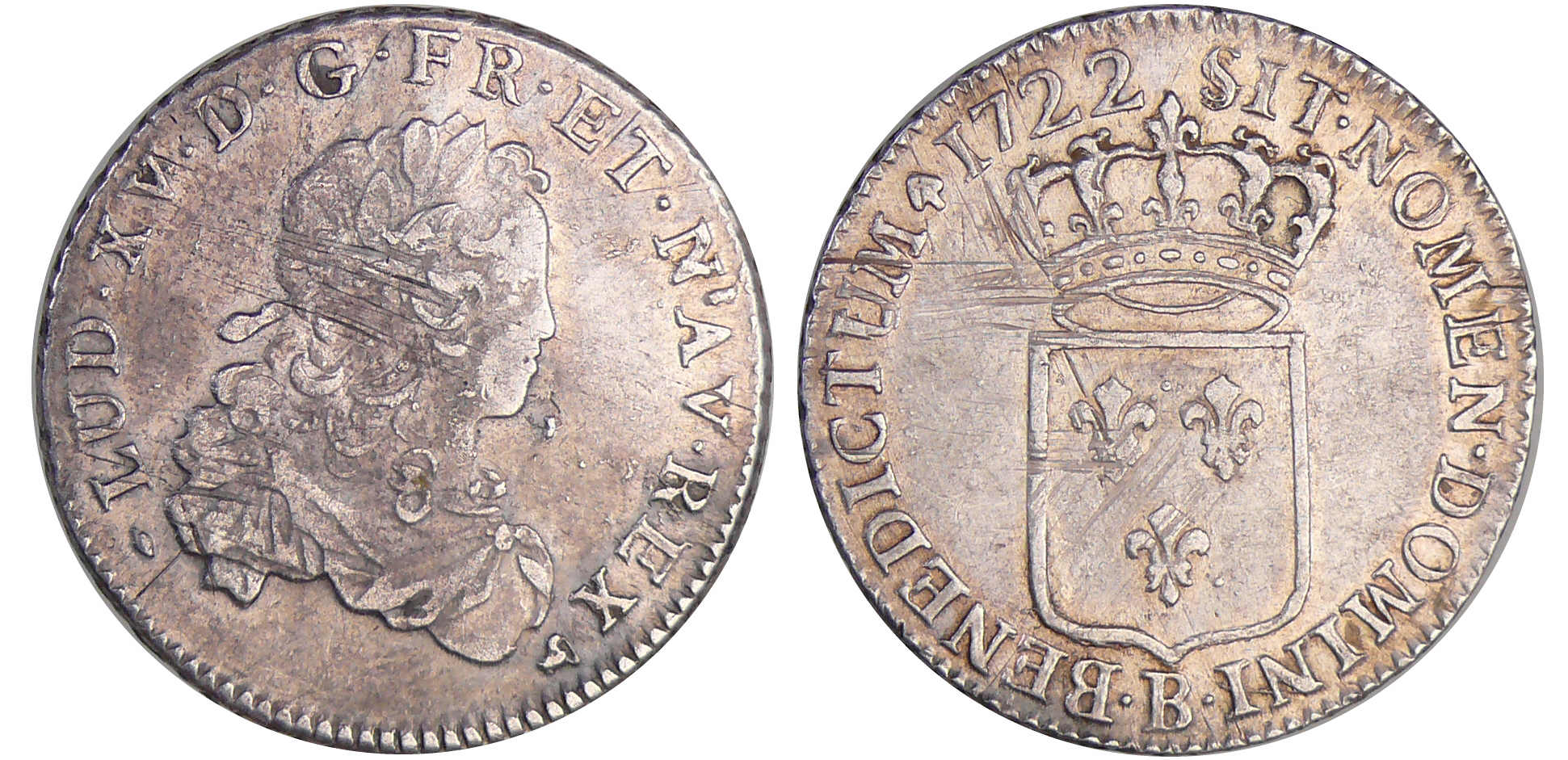 Louis XV (1715-1774) – 1/3 d’écu de France – 1722 B (Rouen) flan neuf