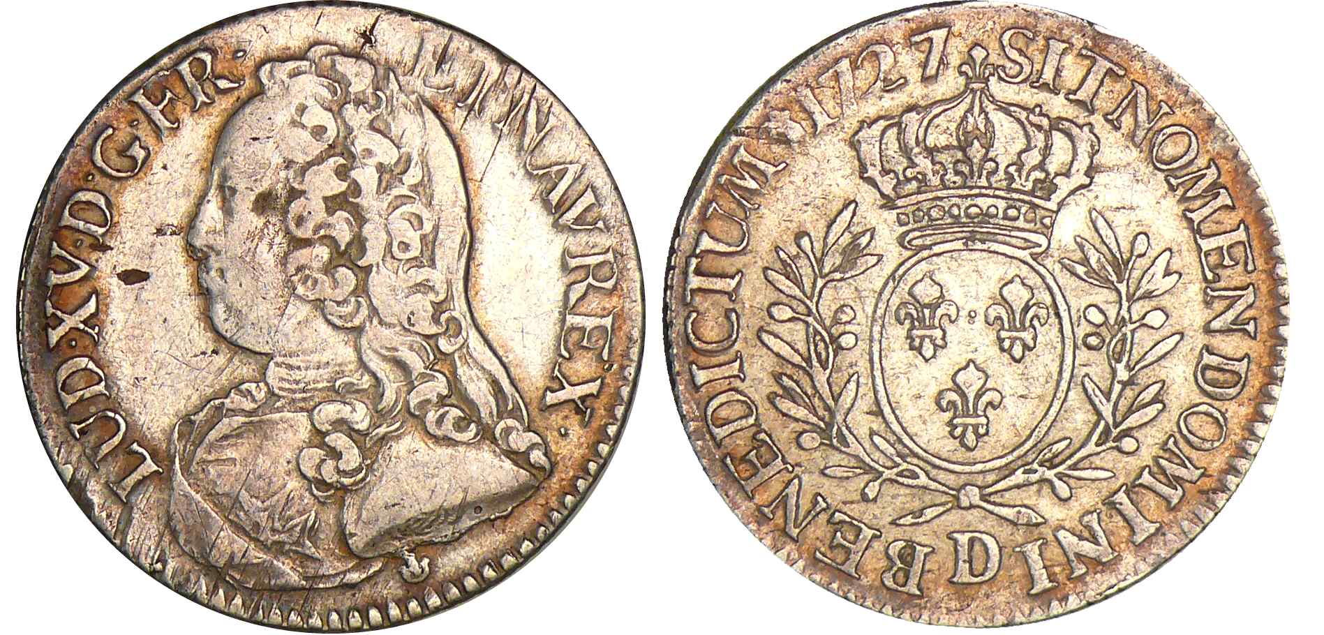 / Louis XV (1715-1774) – 1/5 d’écu aux branches d’olivier – 1727 D (Lyon)