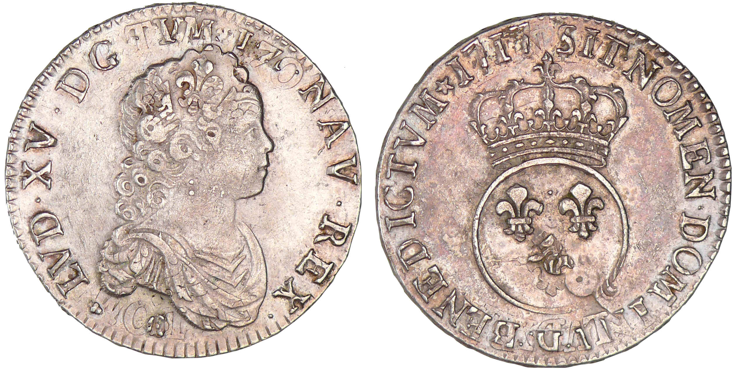 Observation : Etoile à cinq rais avant le millésime Maître graveur : Gland en début de légende du droit = Michel Briosne ou Brionne (1711-1731). Monnaie absente des ouvrages de références où elle ne figure qu’en flan neuf.