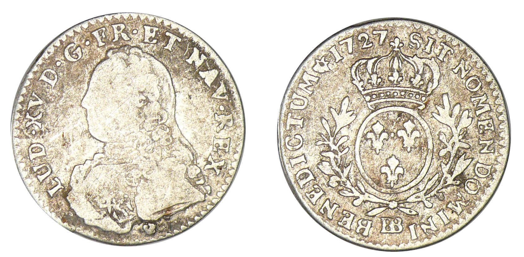/ Louis XV – Dixième d’écu aux lauriers 1727 BB (Strasbourg)