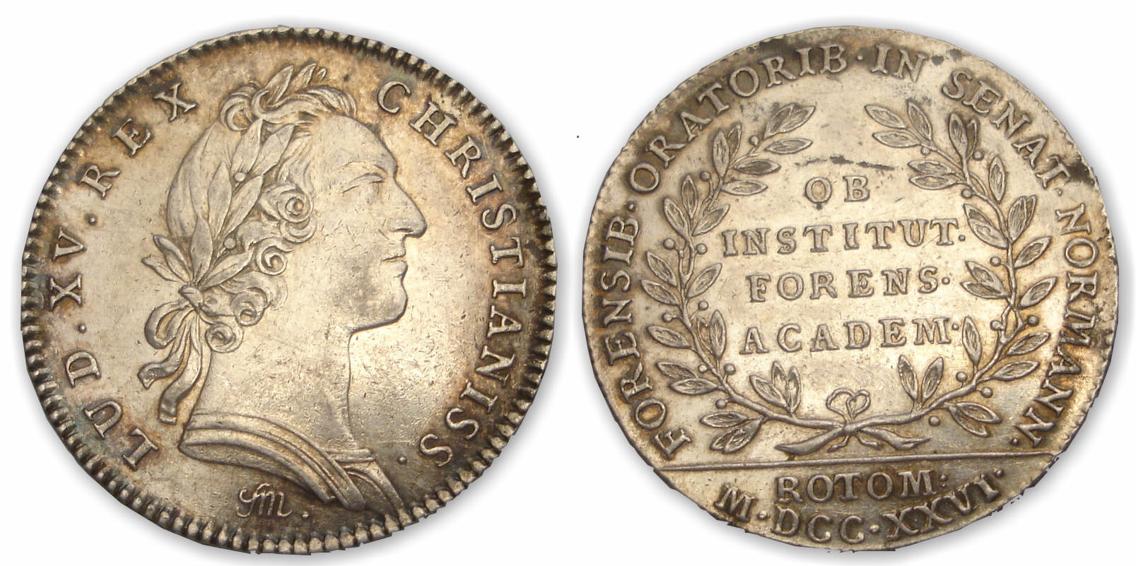 R/ FORENSIB. ORATORIB. IN. SENAT. NORMANN. // ROTOM M.DCC.XXVI Dans le champ au milieu d’une couronne OB INSTITUT. FORENS. ACADEM.