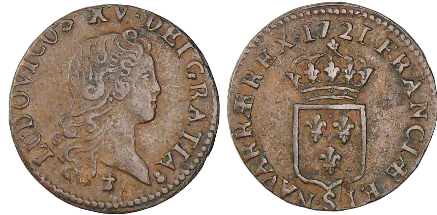 Louis XV – Liard au buste enfantin – 1721 S (Reims)
