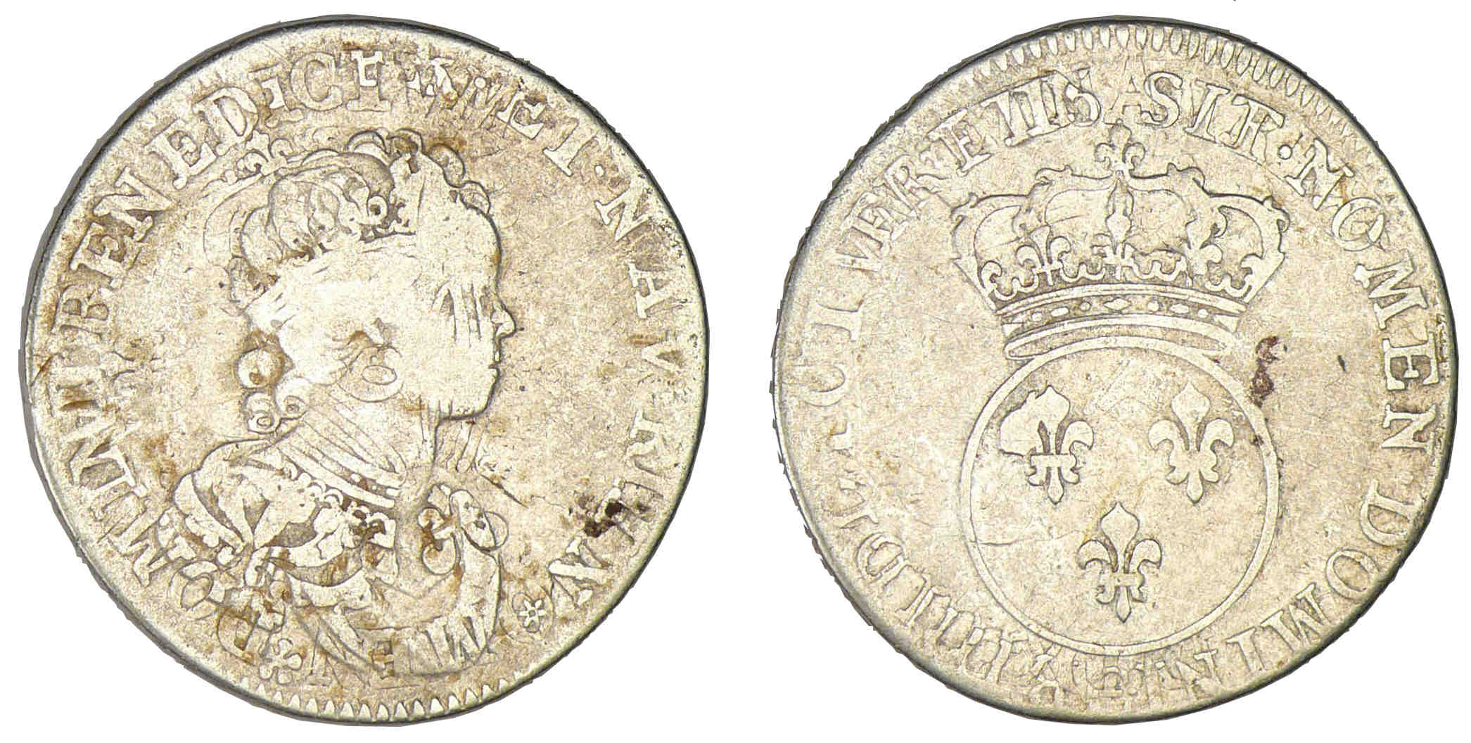 R/ BENEDICTUM (millésime) SIT NOMEN DOMINI (atelier). Ecu rond de France couronné.