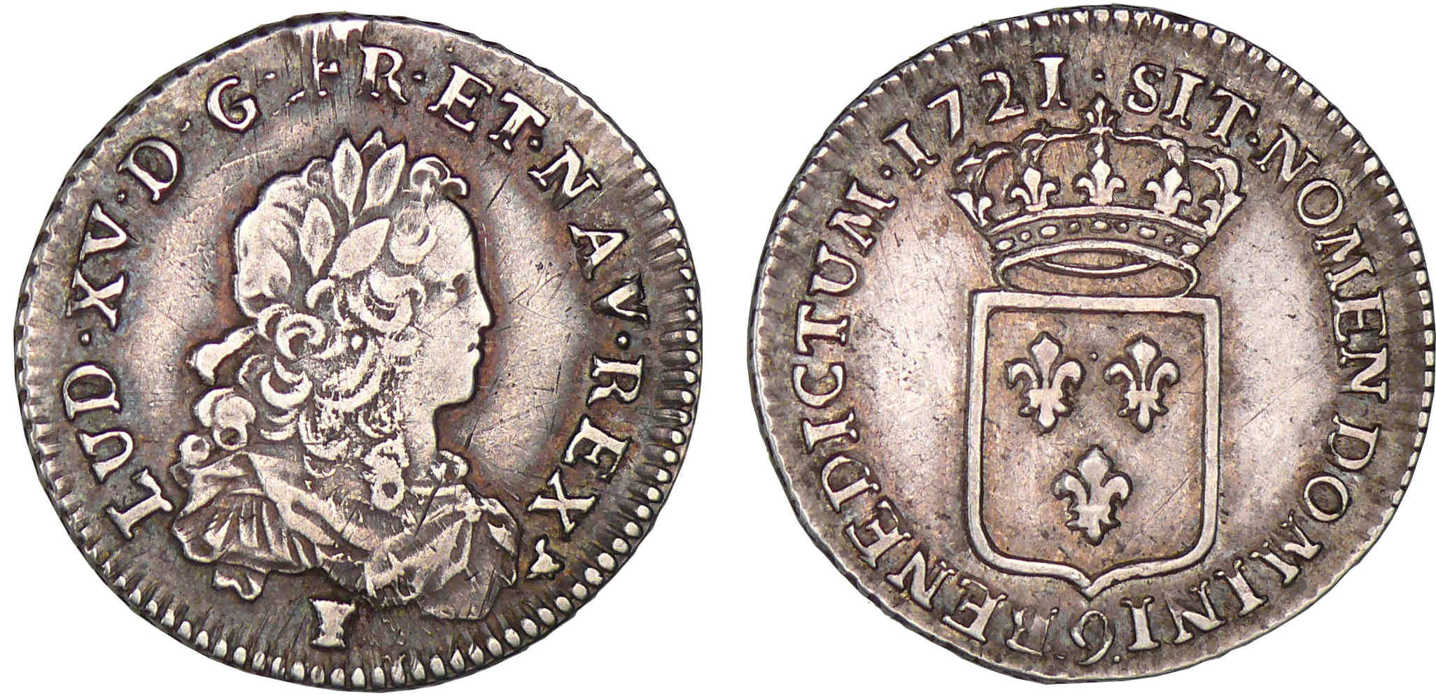 R/ SIT NOMEN DOMINI BENEDICTUM. Ecu de France couronné.