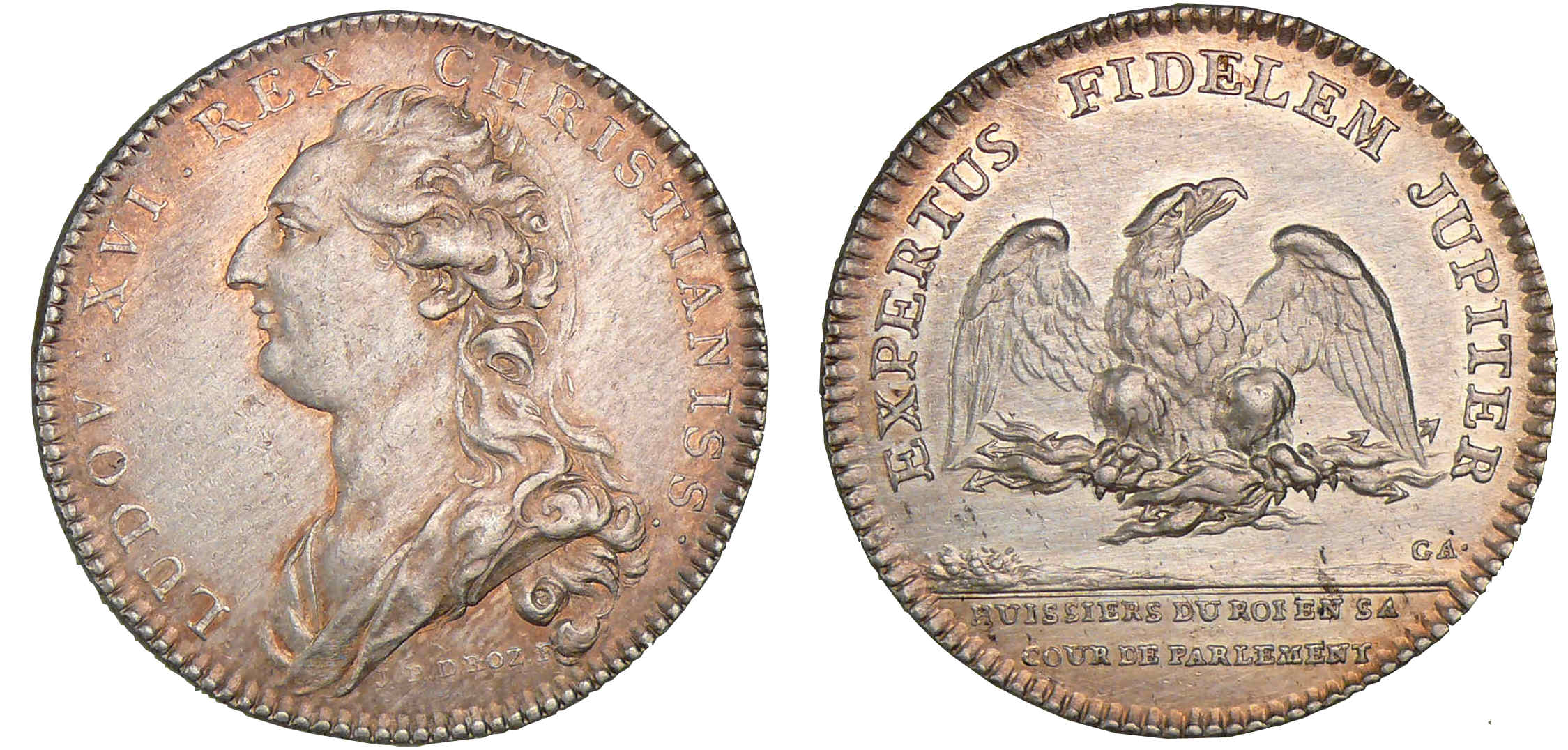 Revers : R/ EXPERTUS FIDELEM JUPITER // HUISSIERS DU ROI EN SA COUR DE PARLEMENT. Aigle de face sur un foudre.