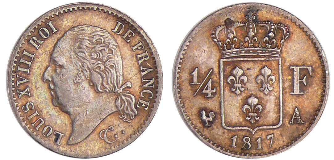 / Louis XVIII (1815-1824) – 1/4 de franc buste nu 1817 A (Paris)