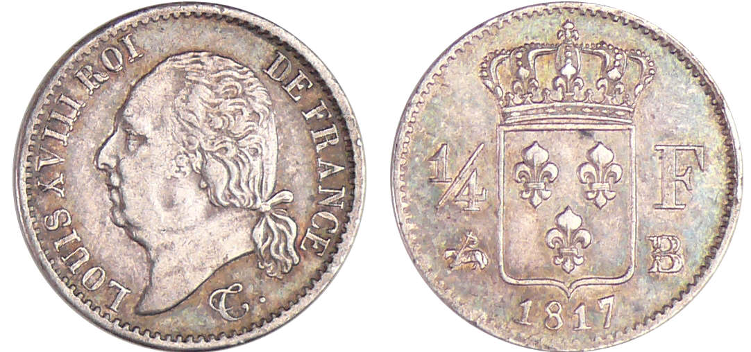 Louis XVIII (1815-1824) – 1/4 de franc buste nu 1817 B (Rouen)