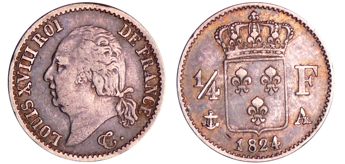 / Louis XVIII (1815-1824) – 1/4 de franc buste nu 1824 A (Paris)