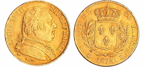 / Louis XVIII (1815-1824) – 20 francs au buste habillé 1814 K (Bordeaux)