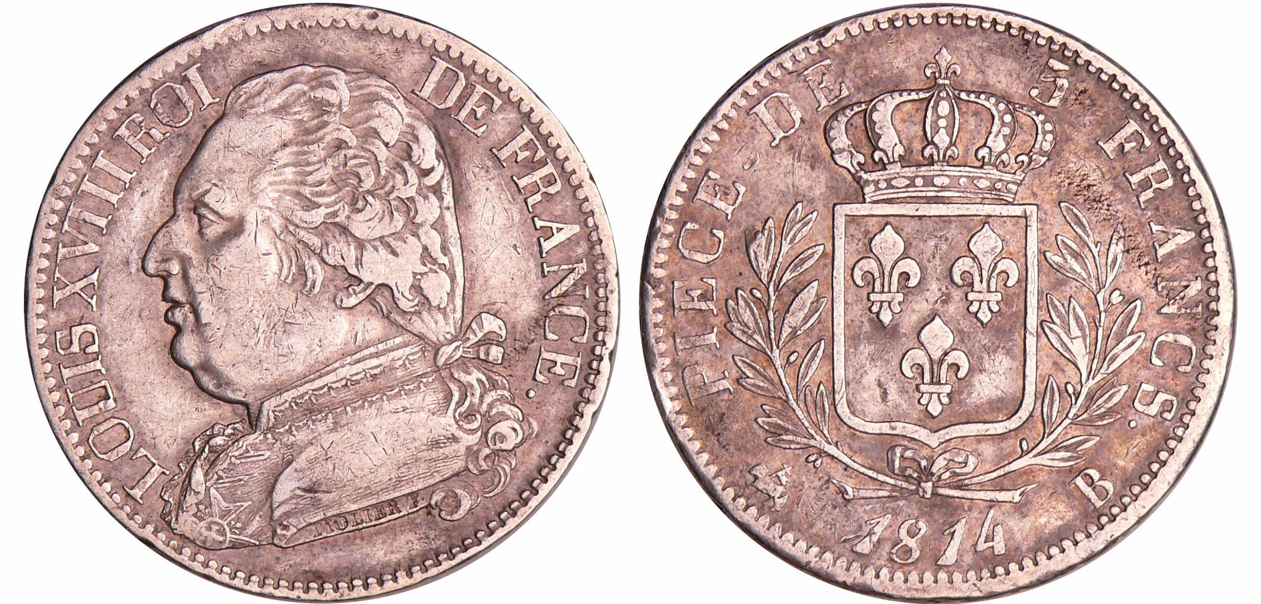 / Louis XVIII (1815-1824) – 5 francs au buste habillé 1814 B (Rouen)