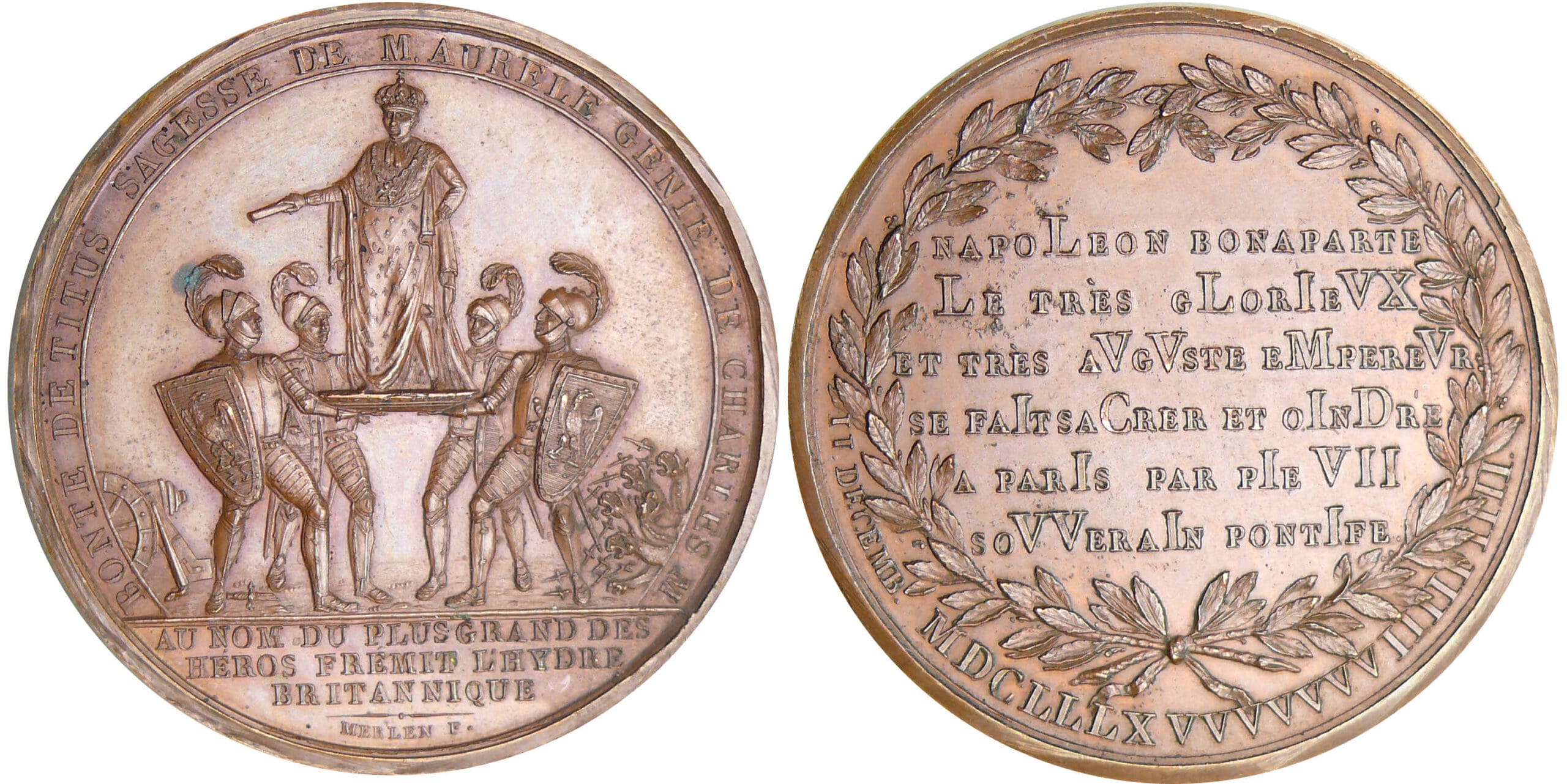 Avers : A/ Napoléon debout sur un bouclier porté par quatre soldats.