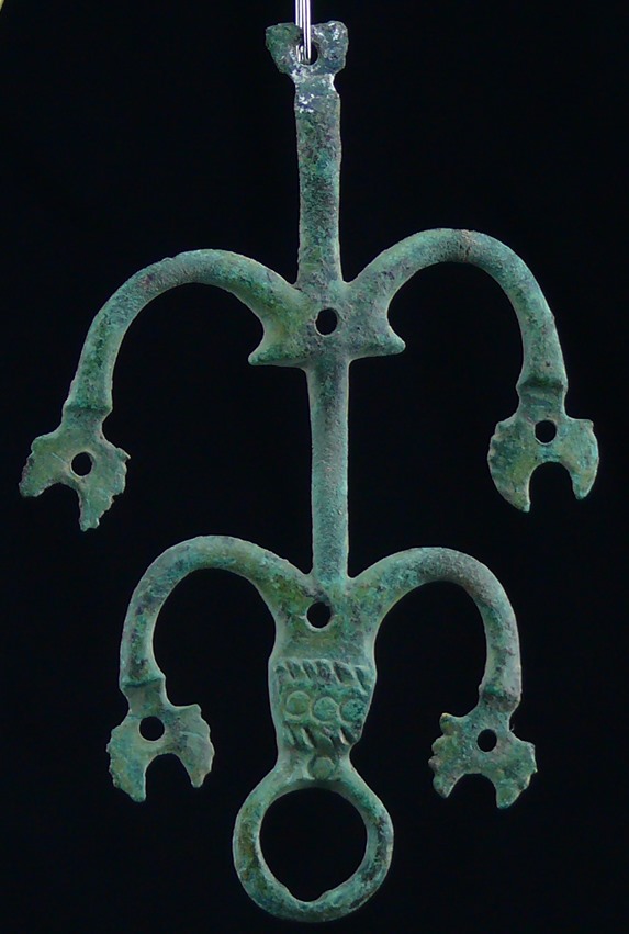 Pendeloque en bronze à quatre bras qui portaient probablement des ornements. 85×55 mm