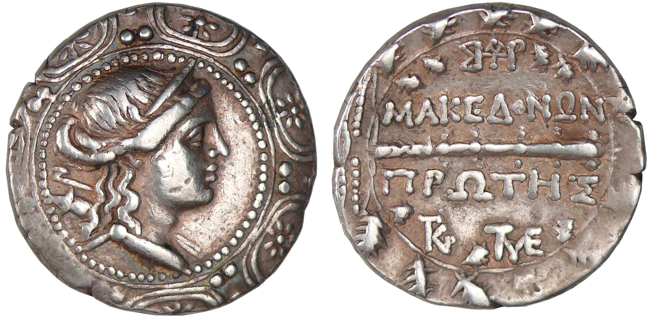 R/ MAKEΔΟΝΩΝ / ΠΡΩΤΗΣ, une massue de part et d’autre. Le tout, dans une couronne de chêne fermée par un foudre.