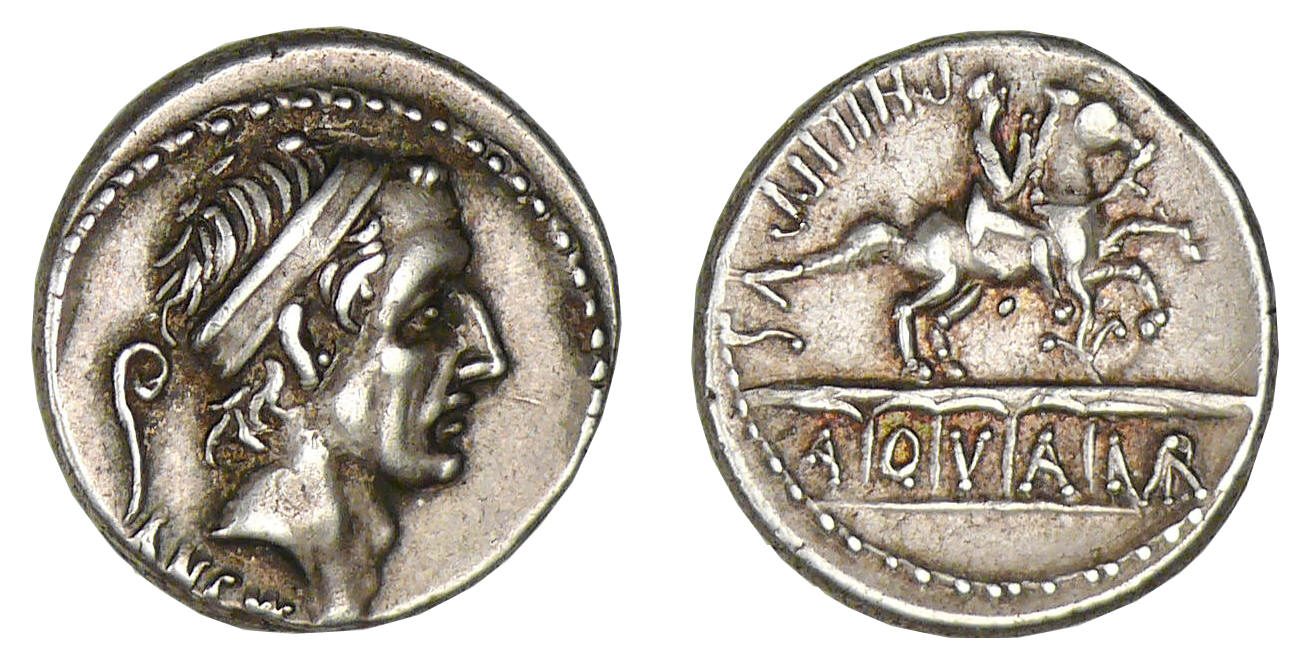 Avers : A/ ANCVS. Tête diadémée du roi Ancus Marcus à droite. Derrière, un lituus.