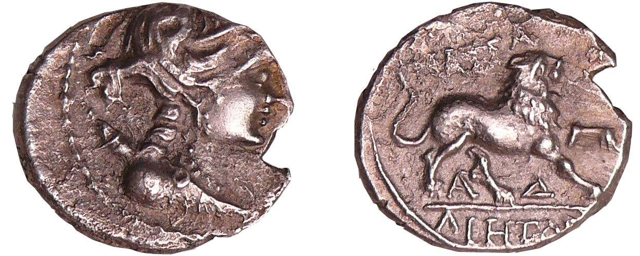 R/ ΜΑΣΣΑ // ΛΙΗΤΩΝ / Α-Δ. Lion à droite sur une ligne d’exergue, deux lettres entre les pattes, listel.