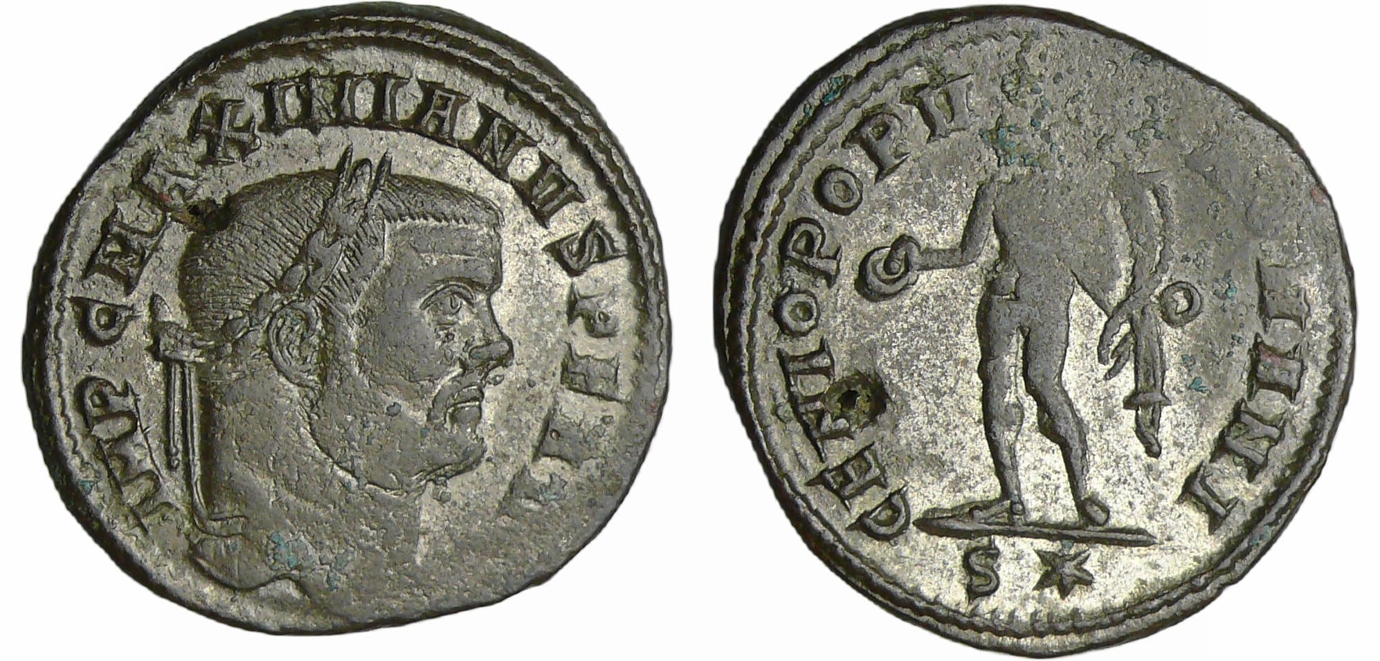 A/ IMP C MAXIMIANVS P F AVG Tête laurée à droite.
