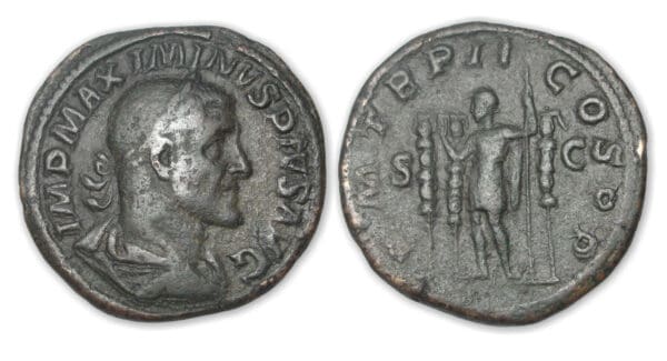 Avers : A/ IMP MAXIMINVS PIVS AVG Buste lauré et drapé à droite.