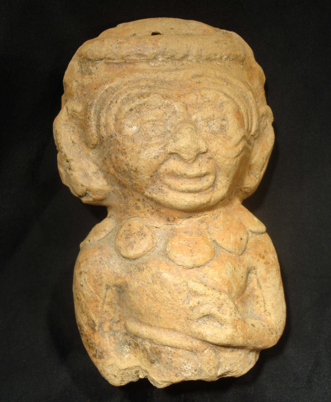 Imporante statuette de femme paré d’un collier et d’une coiffe, les mains posées sur la poitrine, recouverte de son engobe de couleur ocre. . Dimension : 145 mm.