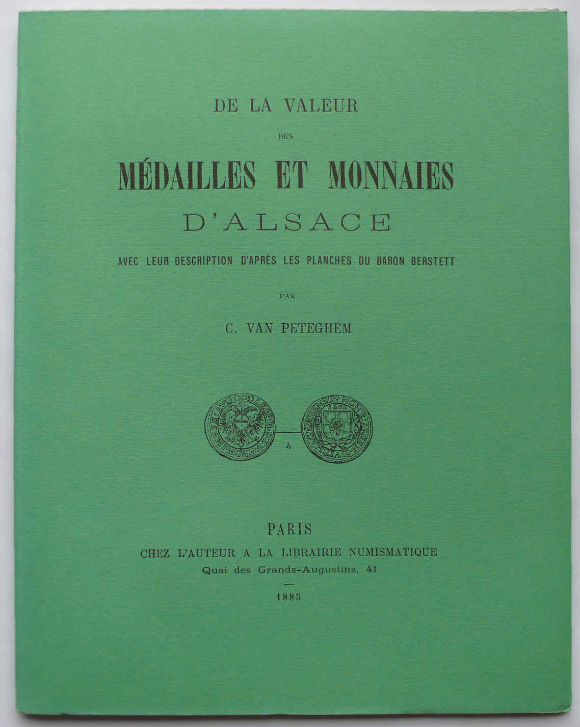 Paris 1885 – Reprit de 1977 – De la valeur des médailles et monnaies d’Alsace par C. Van Peteghem. 40 pages et 16 planches.