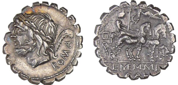 Avers : A/ ROMA. Tête laurée de Saturne à gauche, une harpe derrière la nuque.