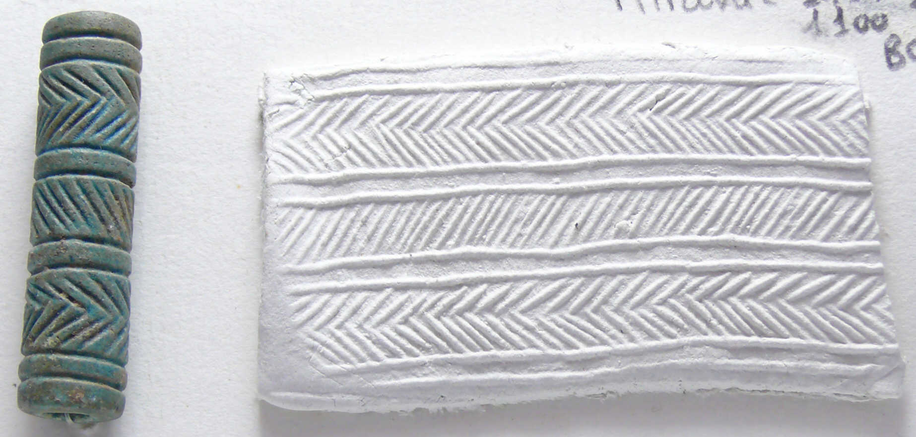 Très beau et grand sceau cylindre en stéatite de couleur vert olive. Le motif représente des frises de chevrons. 40 mm et 10 mm de diamètre.