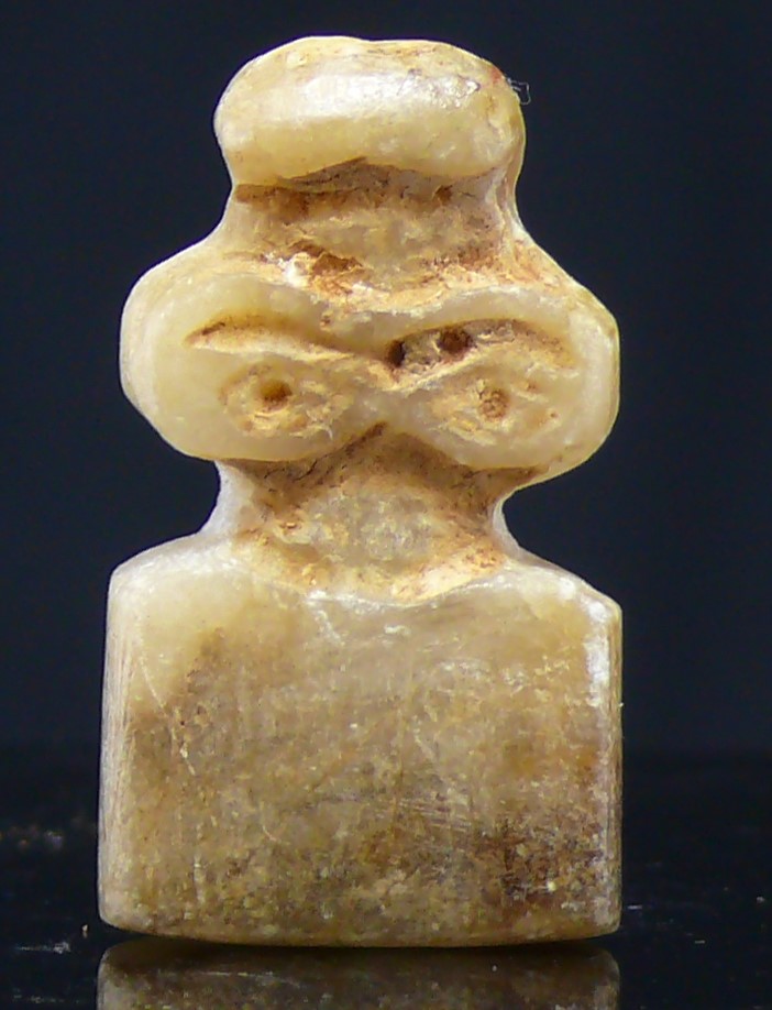 Idole « aux yeux » en albâtre de couleur miel. Dimensions : 30 * 20 mm.