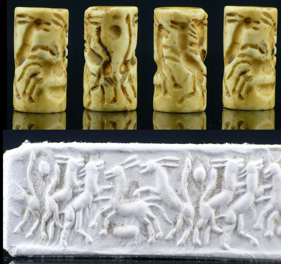 Beau sceau cylindre en pierre blanche dont la scène représente quatre capridés. 25*13 mm