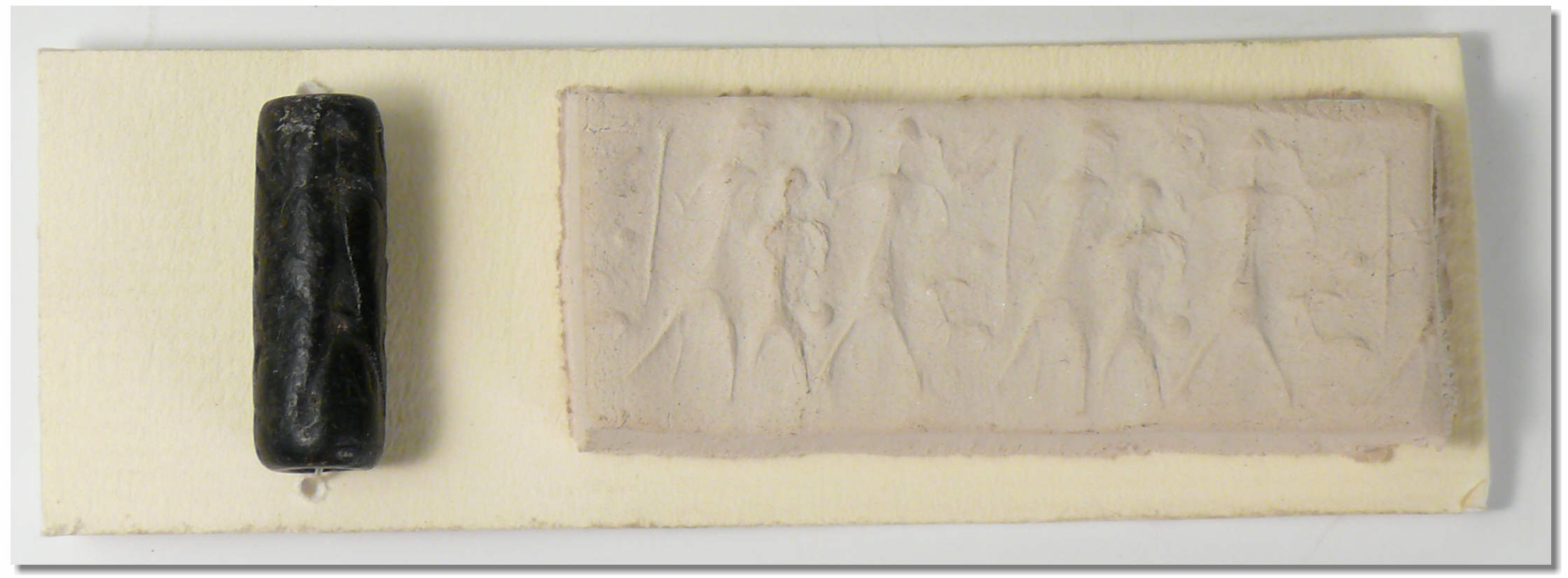 Avers : Sceau cylindre en pierre noire, représentant trois personnages debout et une chèvre – 25 mm.