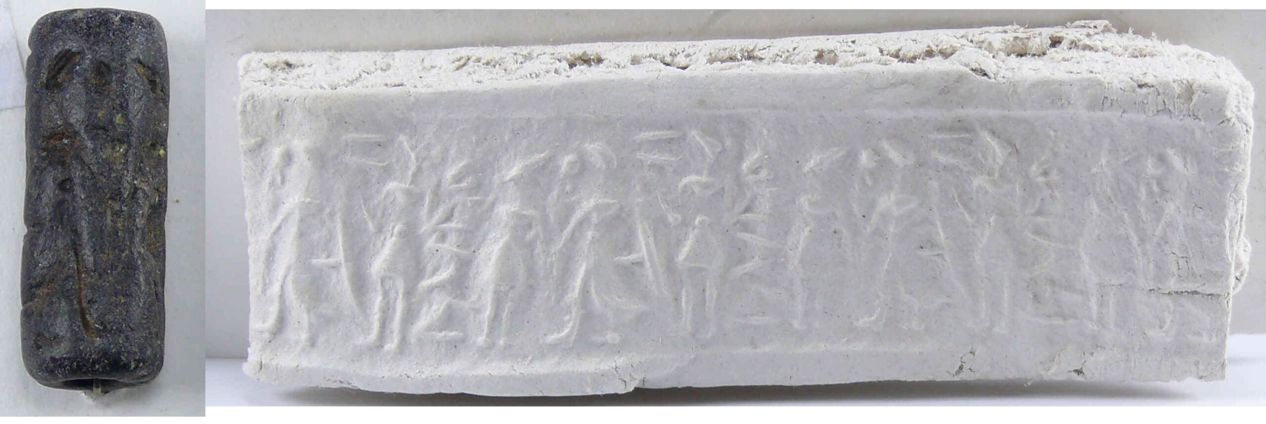 Sceau cylindre en pierre noire représentant des personnages debouts. 19 mm de hauteur.