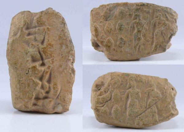 Avers : Sceau de scellement de sac en terre cuite de forme triangulaire comportant des caractères cunéiformes sur une face et d’une scène de 2 personnages debouts devant un damier fait de losanges. 30 mm.