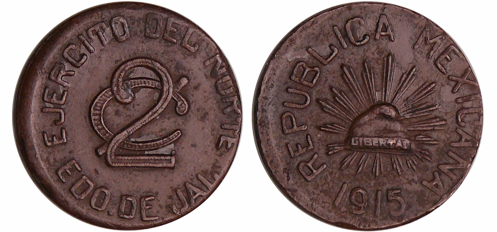 Mexique – Révolution Pancho VILLA Jalisco (Guadalajara) – 2 centavos 1915