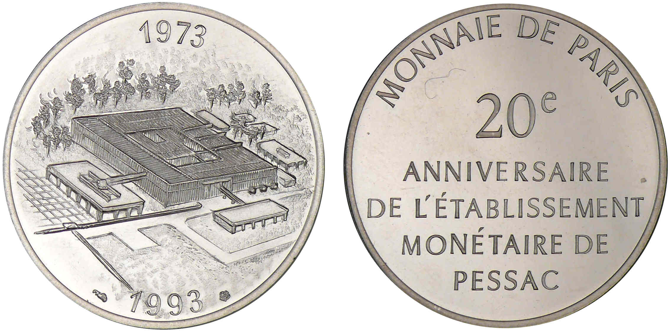 Revers : R/ MONNAIE DE PARIS 20e ANNIVERSAIRE DE L’ETABILISSEMENT MONETAIRE DE PESSAC.