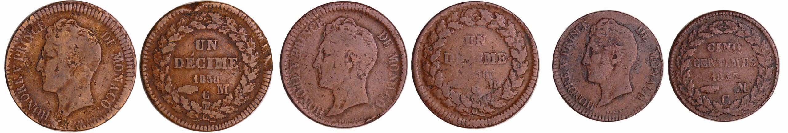 quantité de Monaco - Honoré V (1819-1841) - Lot de 3 monnaies de 5 et 10 centime 1837 et 1838