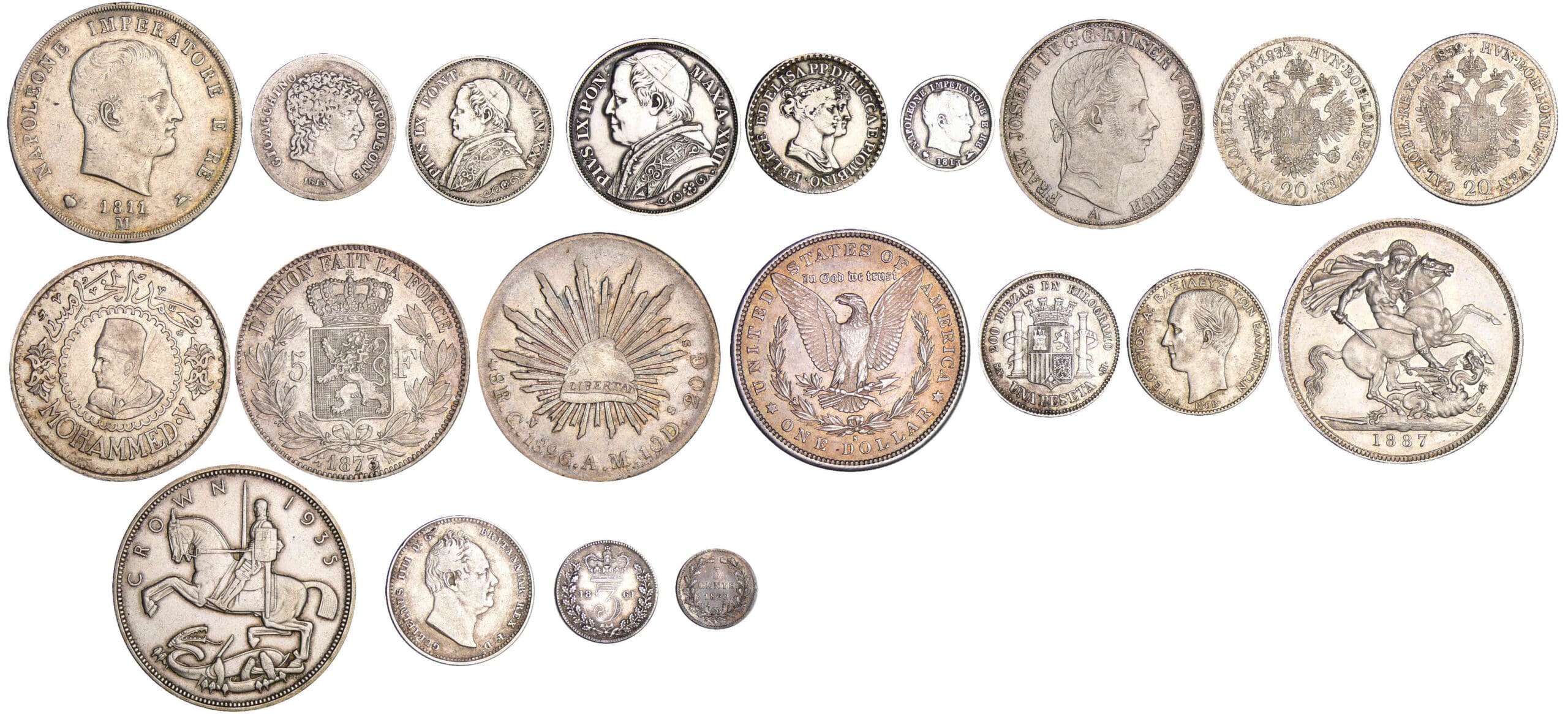 Avers : 5 lire 1811 M, lire 1813, lire 1866, 2 lire 1867, franco 1806, 5 soldi 1813, Taler 1858, 20 kreuzer 1832, 20 kreuzer 1832, 500 francs 1956, 5 francs 1873, 8 reales 1896, dollar 1880 S, peseta 1869