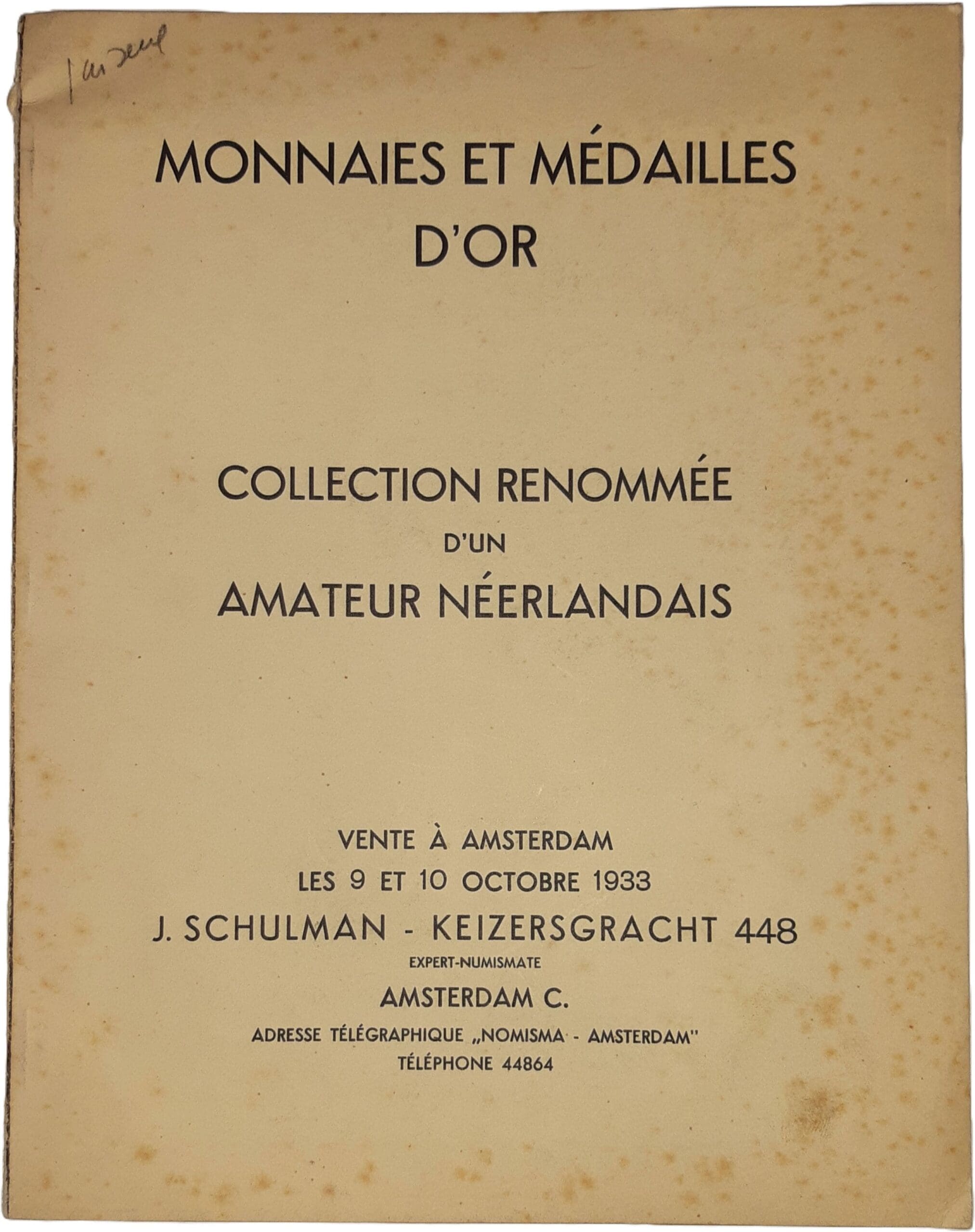 Avers : Catalogue broché de la vente Schulman des 9 et 10 octobre 1933. 31 pages de textes et 14 planches.