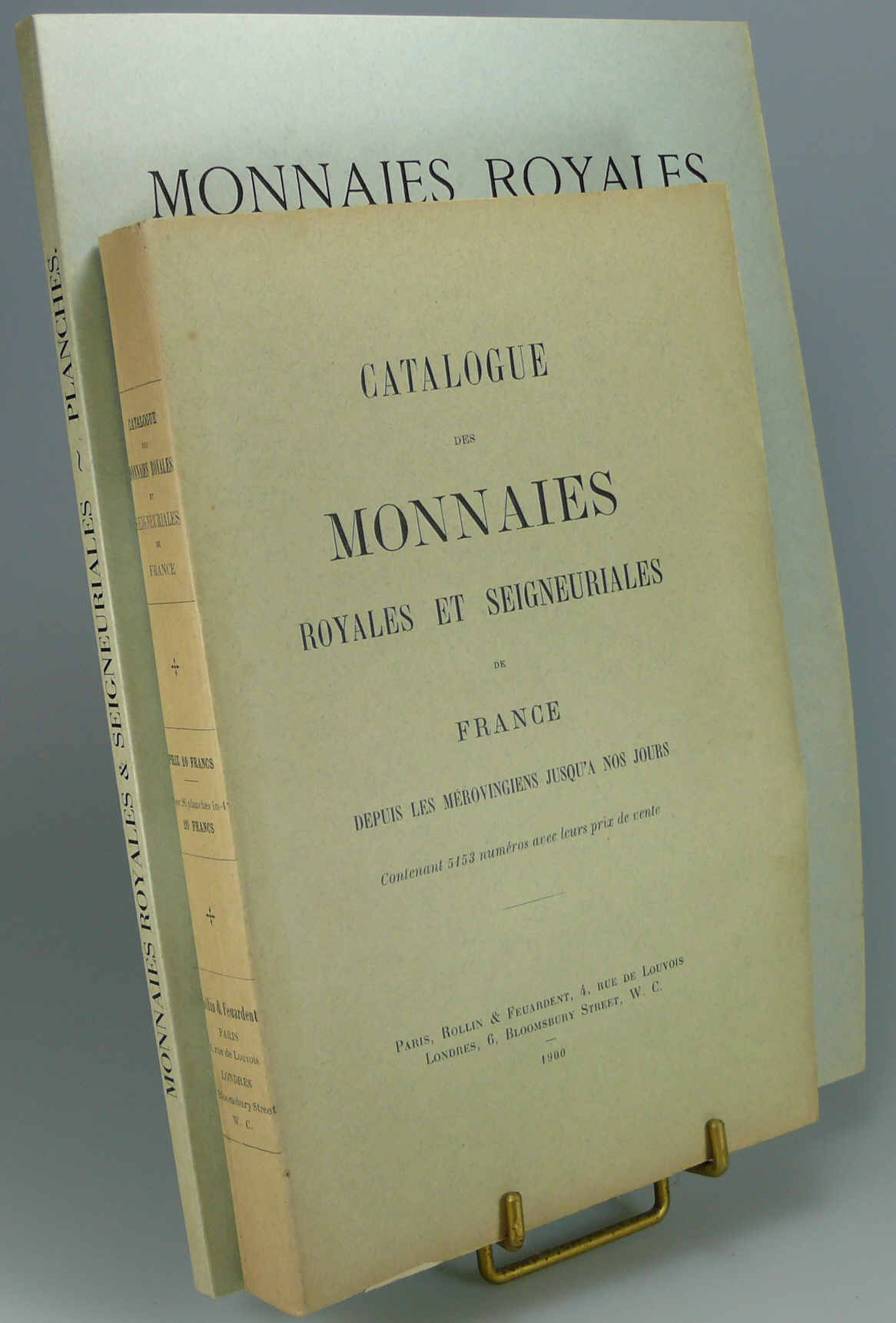 Avers : Paris 1900 – 2 volumes. 1er volume Description des monnaies suivant les rois et leur époque (mérovigiens, capétiens.) contenant 5153 numéros avec leurs prix de vente- volume de 451 pages. 2e volume Paris 1900 – 8 pages de tables des planches des monnaies.