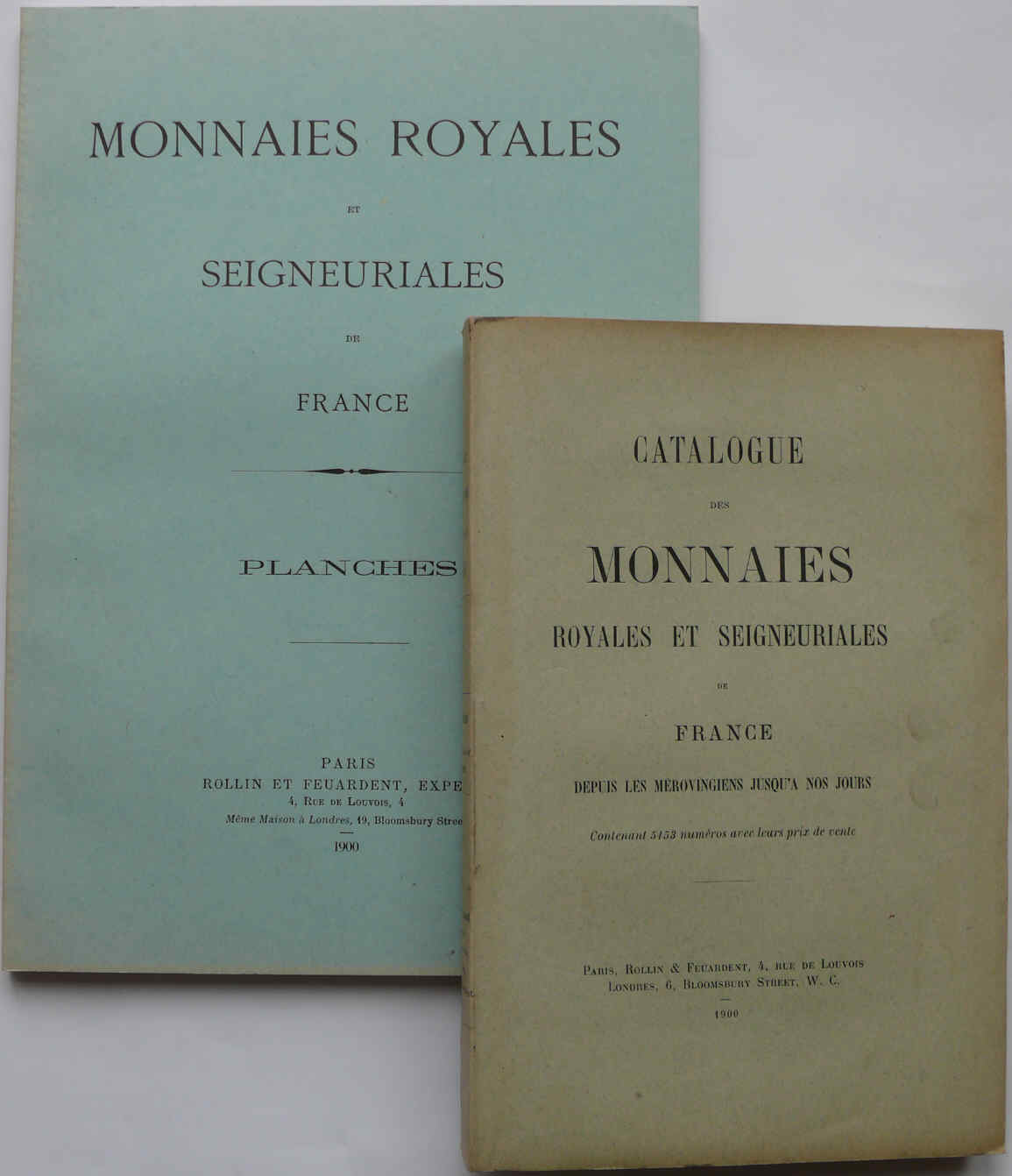 Avers : Paris 1900 – 2 volumes. 1er volume Description des monnaies suivant les rois et leur époque (mérovigiens, capétiens.) contenant 5153 numéros avec leurs prix de vente- volume de 451 pages. 2e volume Paris 1900 – 8 pages de tables des planches des monnaies.
