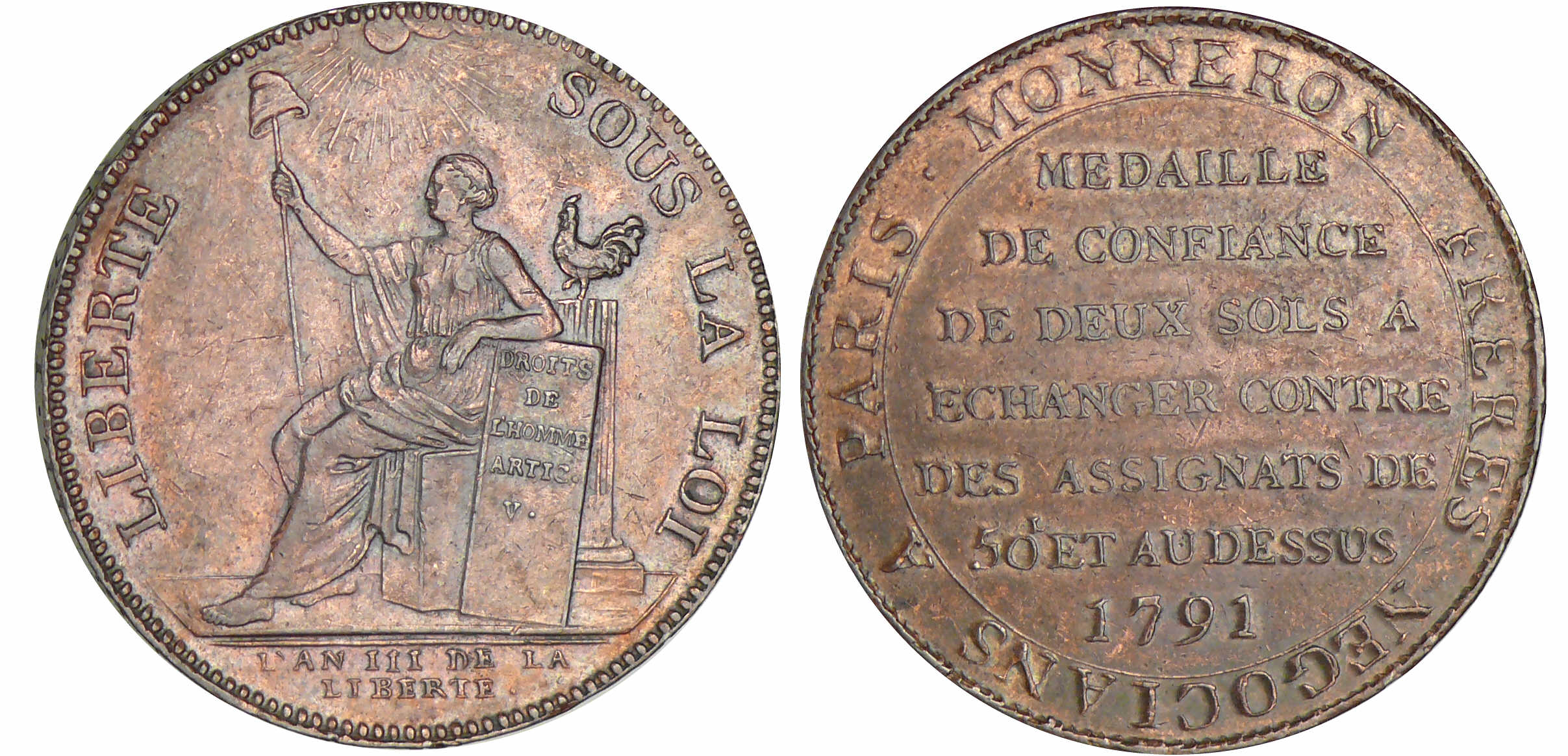 Revers : R/ MEDAILLE DE CONFIANCE DE DEUX SOLS A ECHANGER CONTRE : DES ASSIGNATS DE 50 L ET AU DESSUS autour MONNERON FRERES NEGOCIANS A PARIS. Date à l’exergue 1791