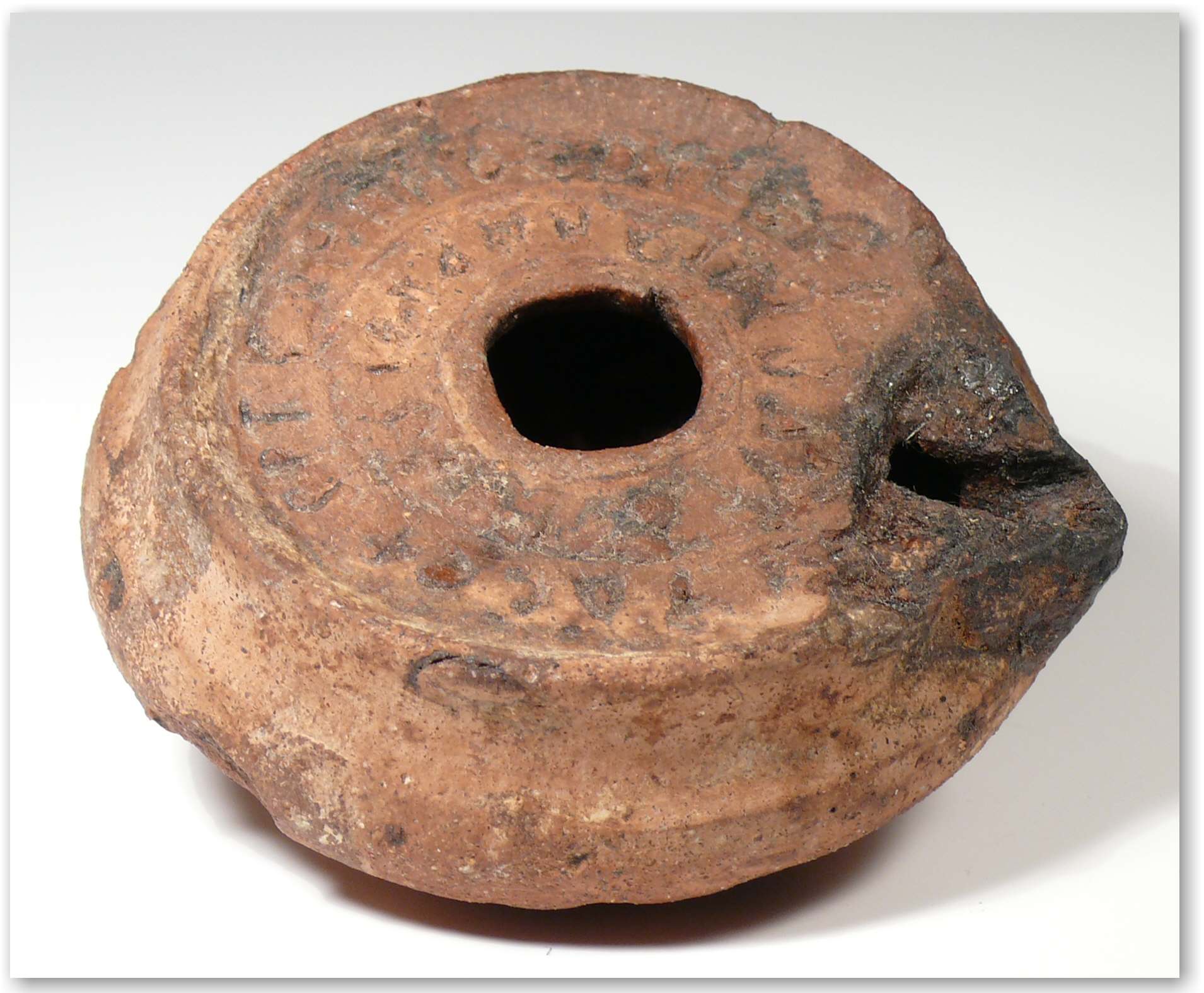 Lampe circulaire en terre cuite sur laquelle on peut voir 2 lignes de texte circulaire en langue sabéenne ou quatabânite – 78×32 mm.