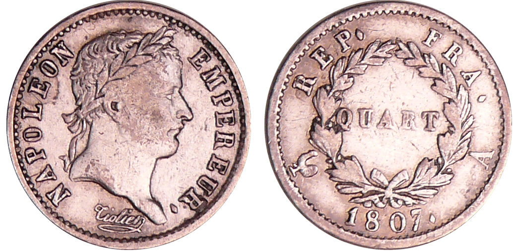Napoléon 1er (1804-1814) – 1/4 de franc revers république 1807 A (Paris)