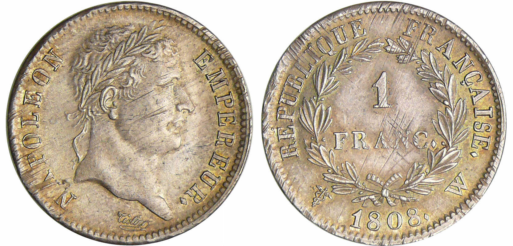 Napoléon 1er (1804-1814) – 1 franc revers république 1808 W (Lille)