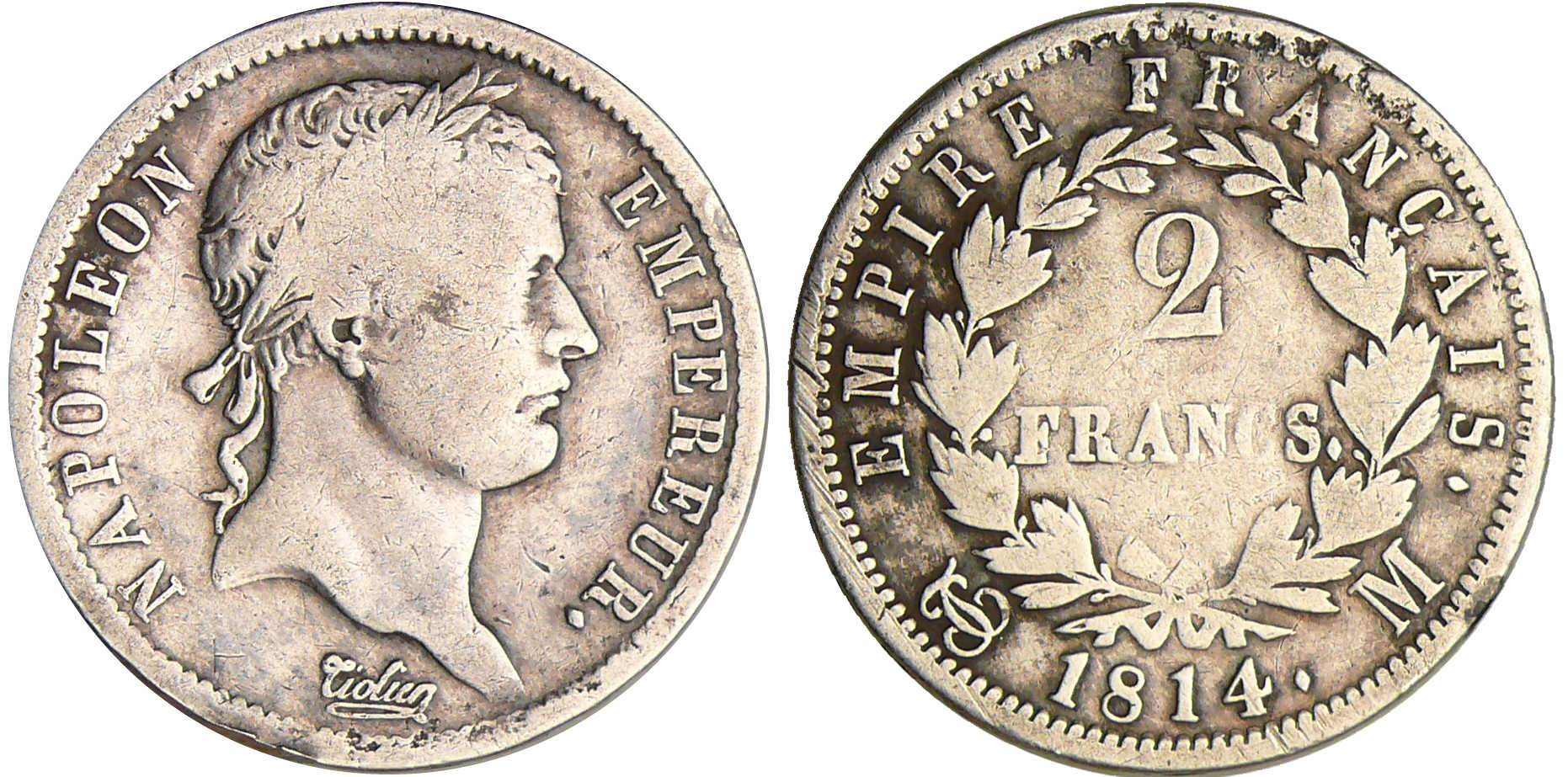 Napoléon 1er (1804-1814) – 2 francs revers empire 1814 M (Toulouse)