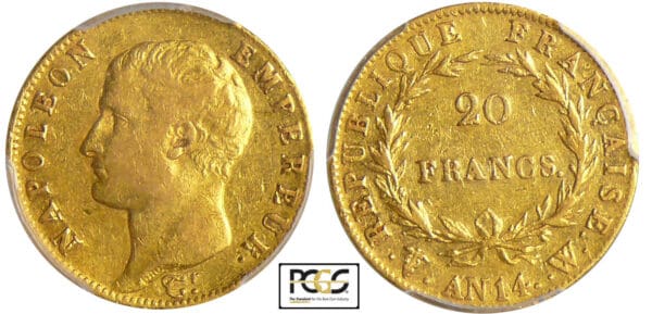 / Napoléon 1er (1804-1814) – 20 francs tête nue An 14 W (Lille)