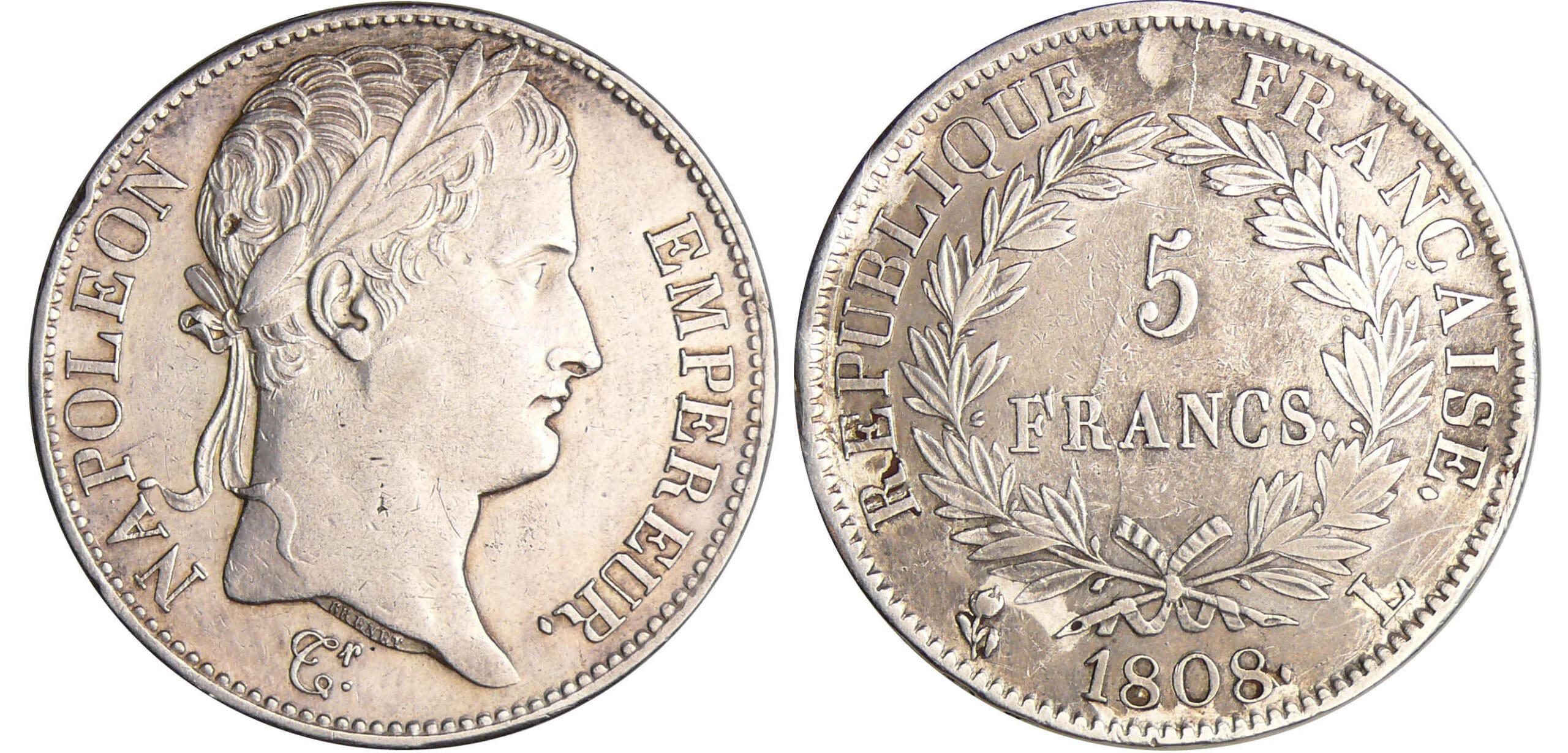 / Napoléon 1er (1804-1814) – 5 francs revers république 1808 L (Bayonne)