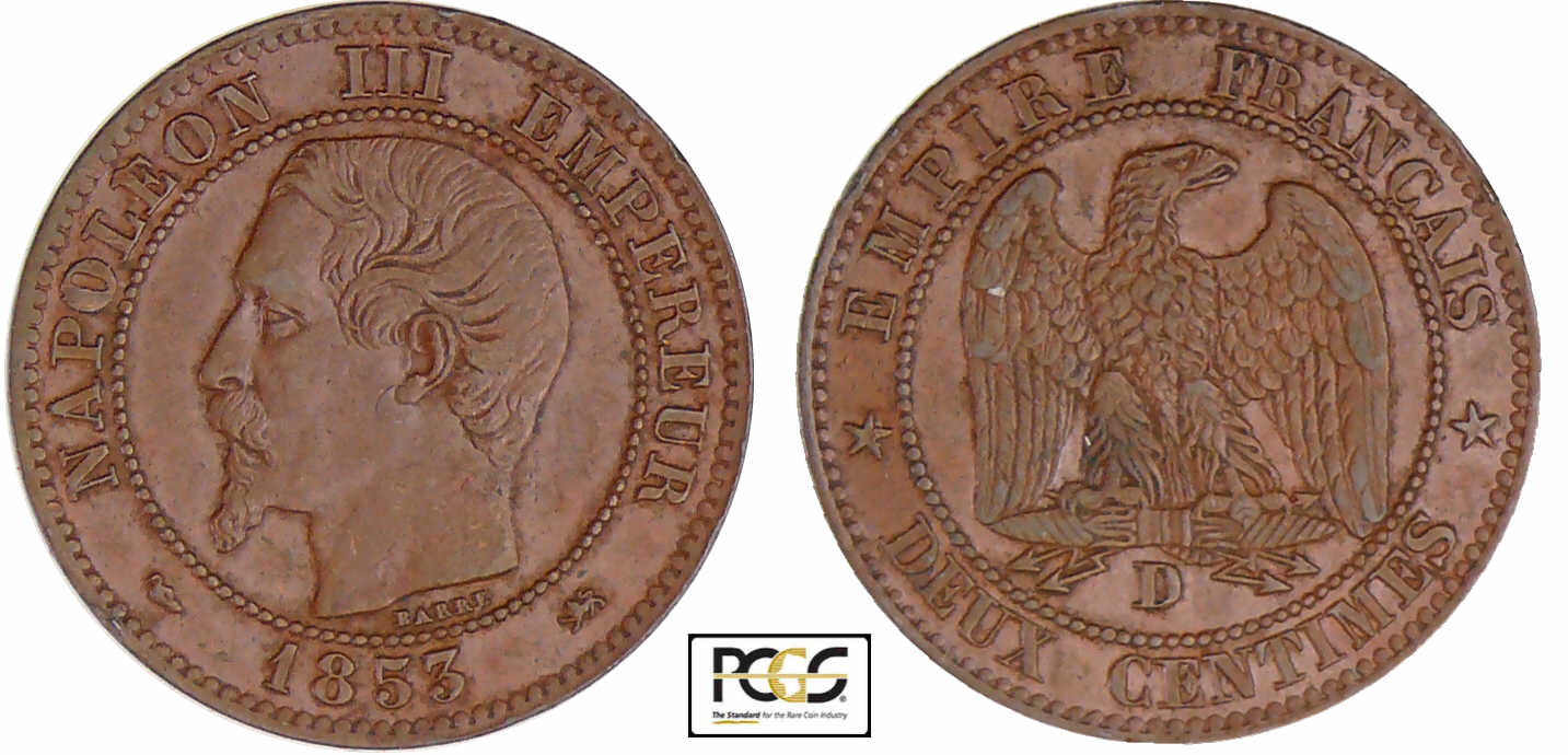 Napoléon III (1852-1870) – 2 centimes tête nue 1853 D (Lyon) grand D